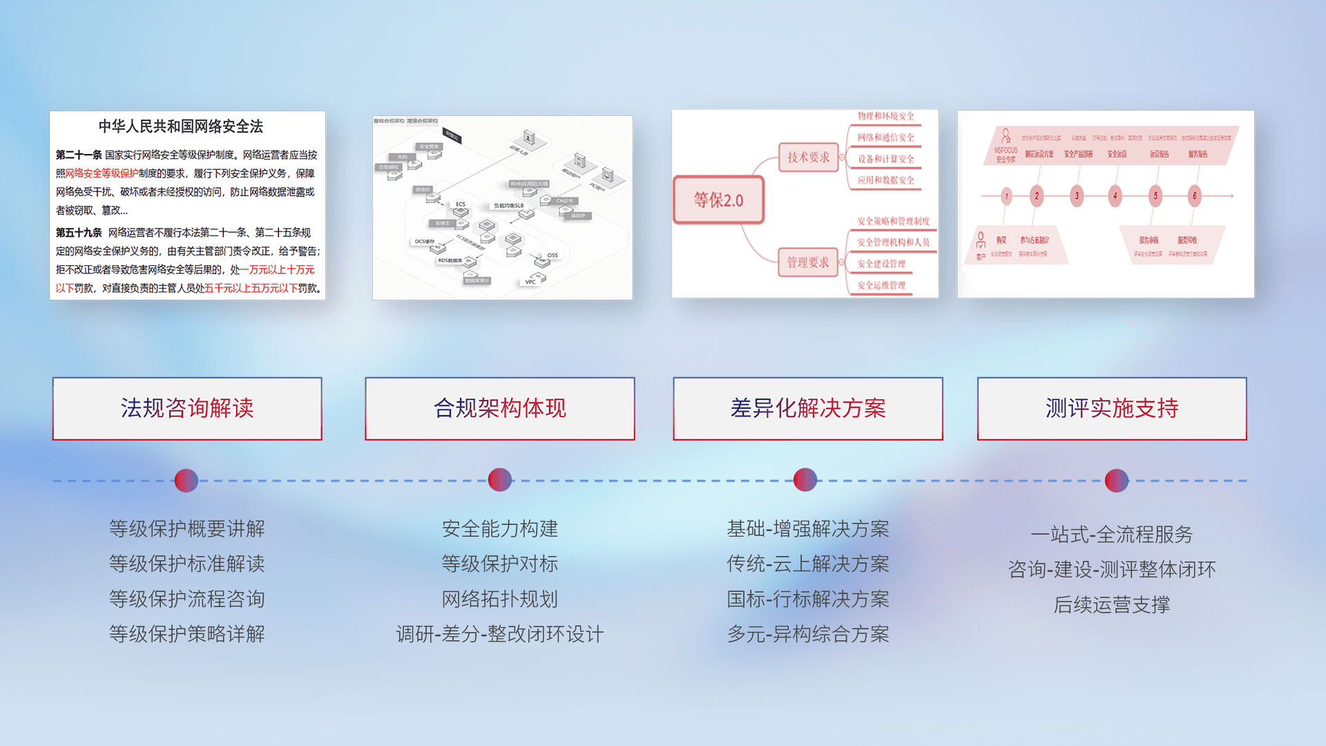 通过专业的法律咨询解读、、、、合规架构体现、、、、差异化解决方案、、、测试实施支持等服务,,,,为客户量身打造等保合规体系。。。